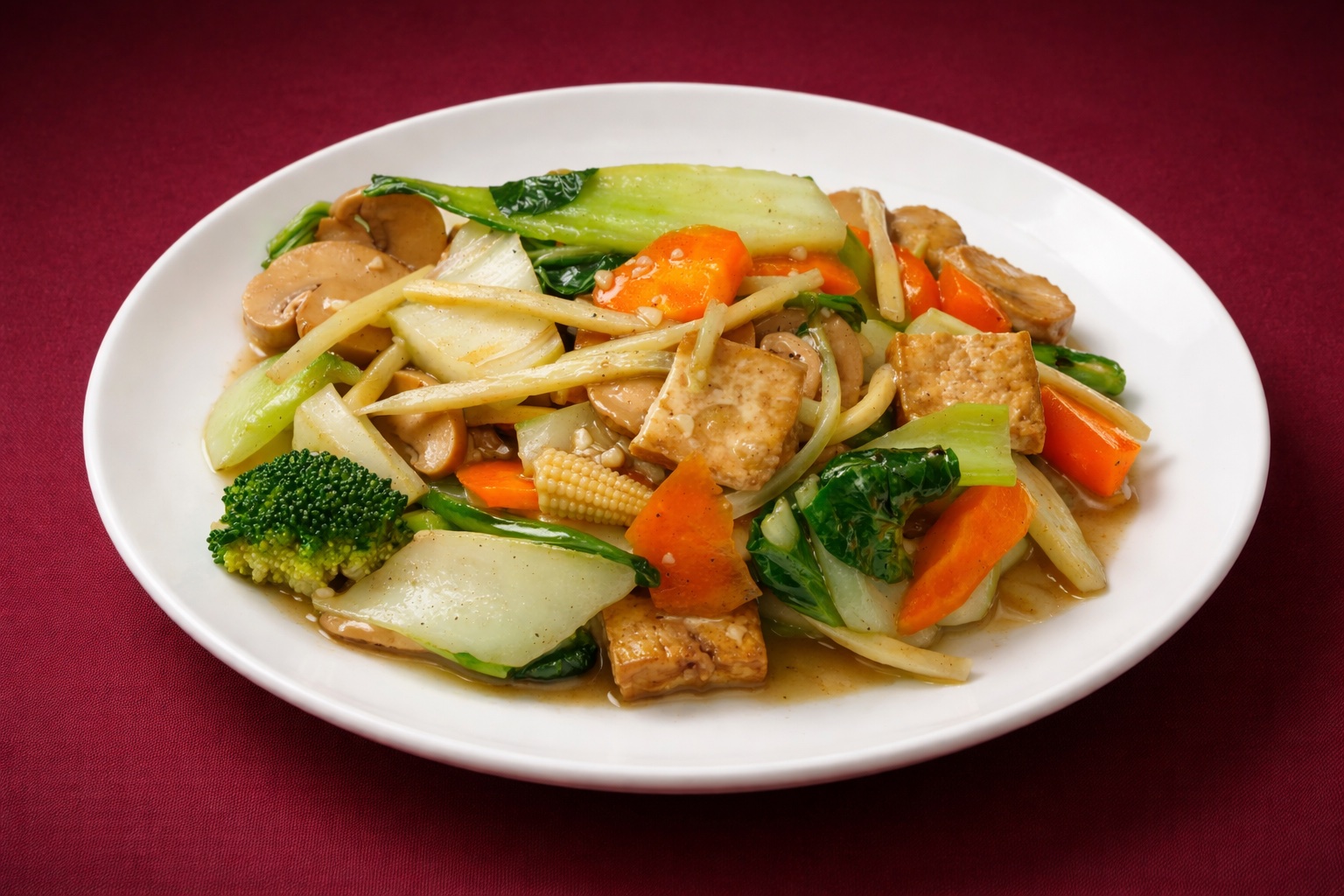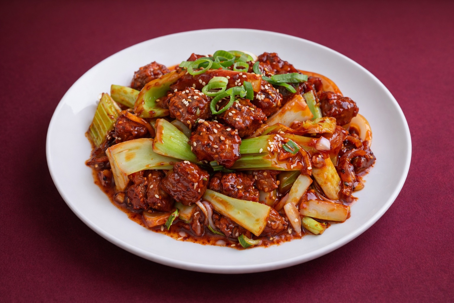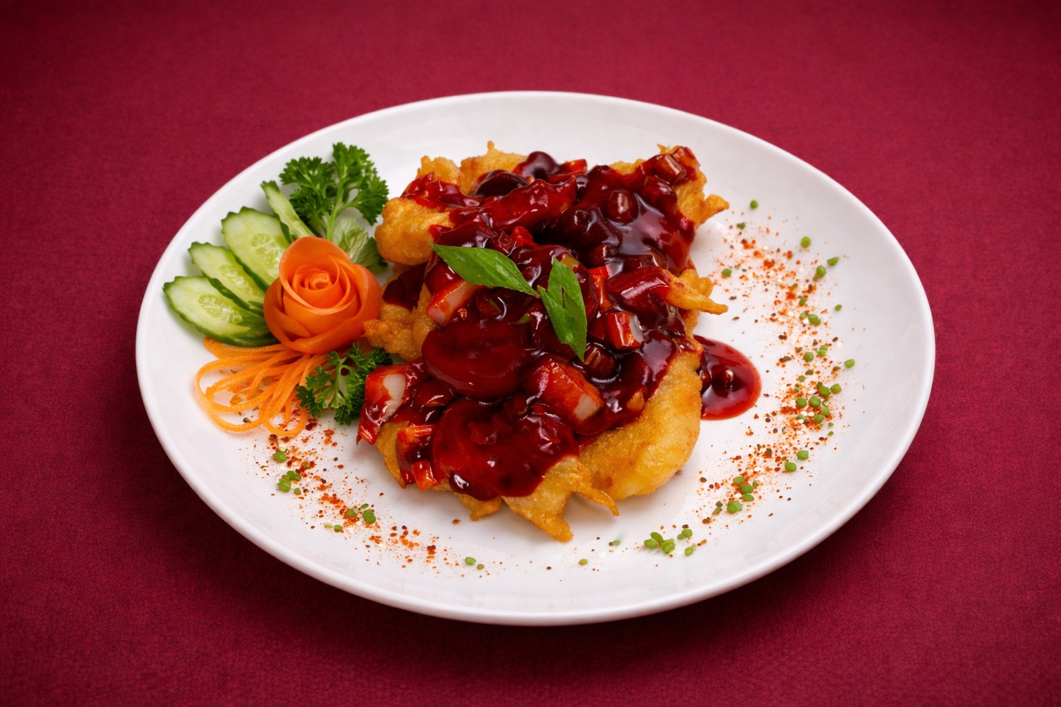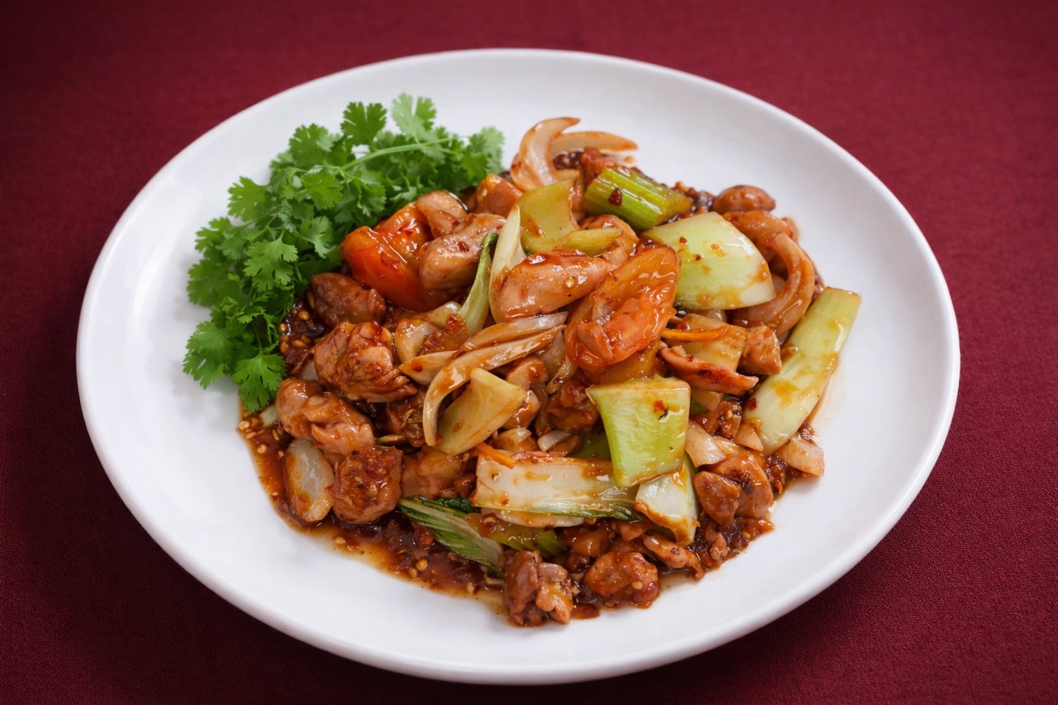 Diced chicken and seasonal vegetables wok toasted with seafood chilli sauce0