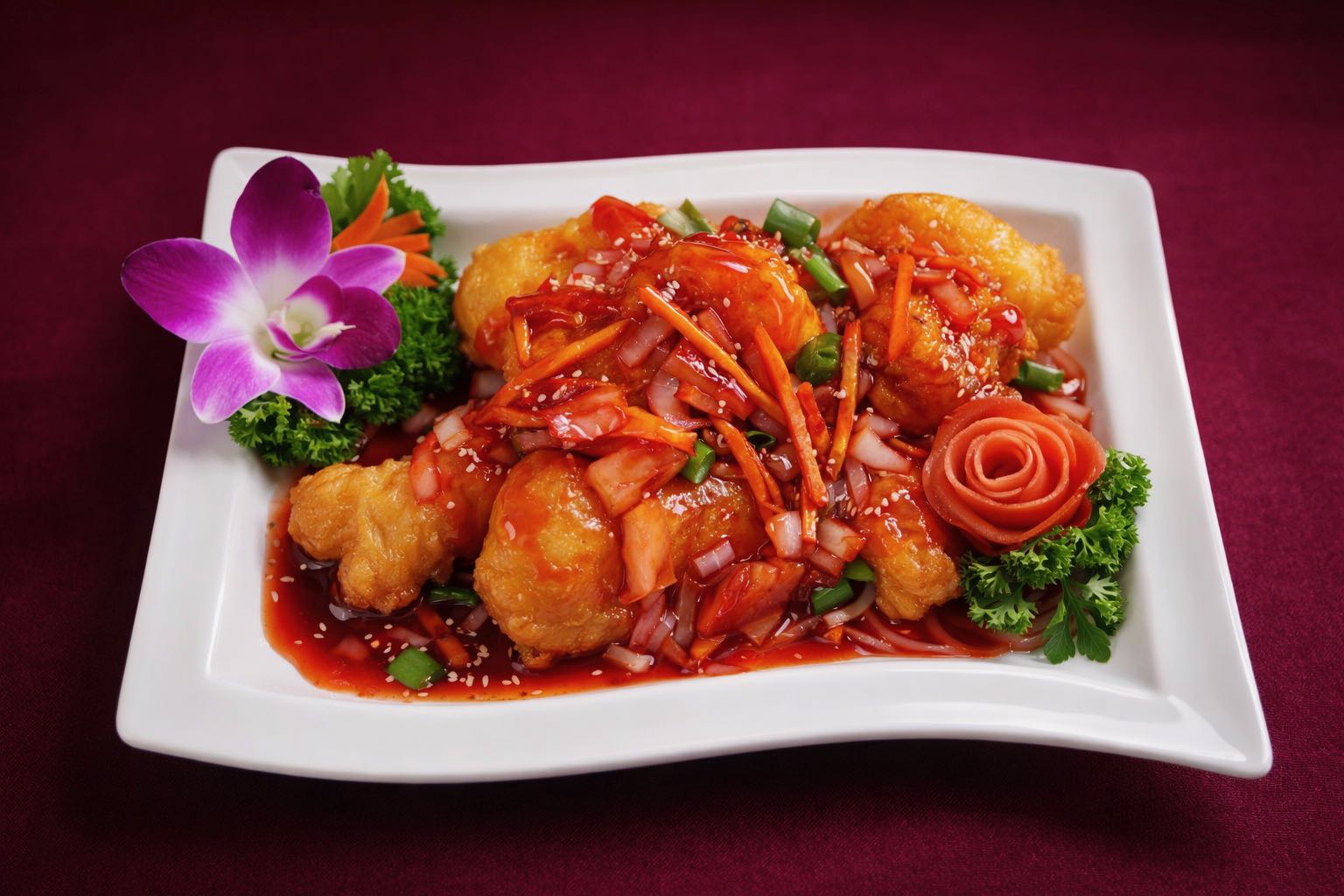 Lightly battered pork and vegetables Served in tangy sauce.0