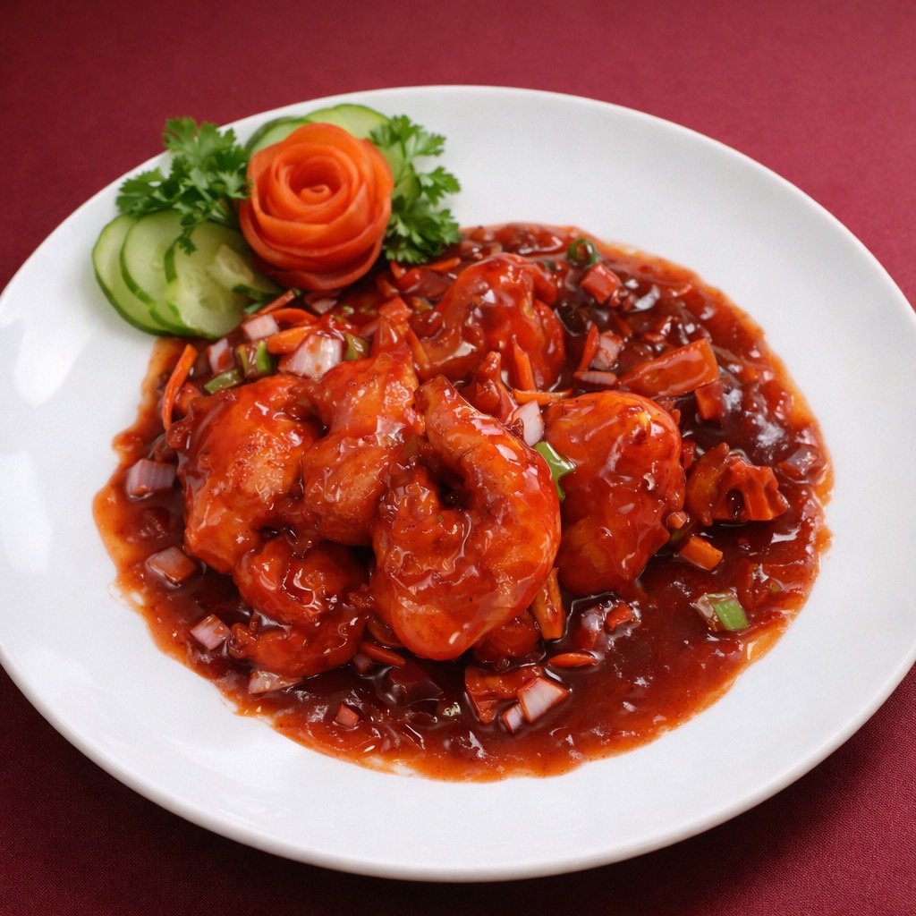 Diced chicken with red chilies, garlic, bell peppers, and onions for a spicy, savory delight.0
